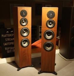 Grosse Standlautsprecher mit kraftvollem und dynamischem Klang. 3-Weg, 4 Treiber, Bassreflex. Ab Ausstellung in dark Walnut mit 3 Jahren Garantie.